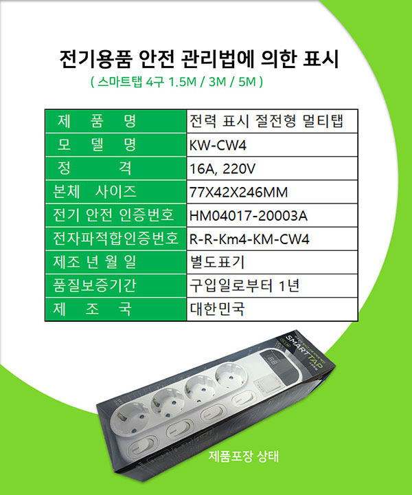 - 스마트탭 4구 1.5M/3M/5M 신호등 멀티탭 국내생산